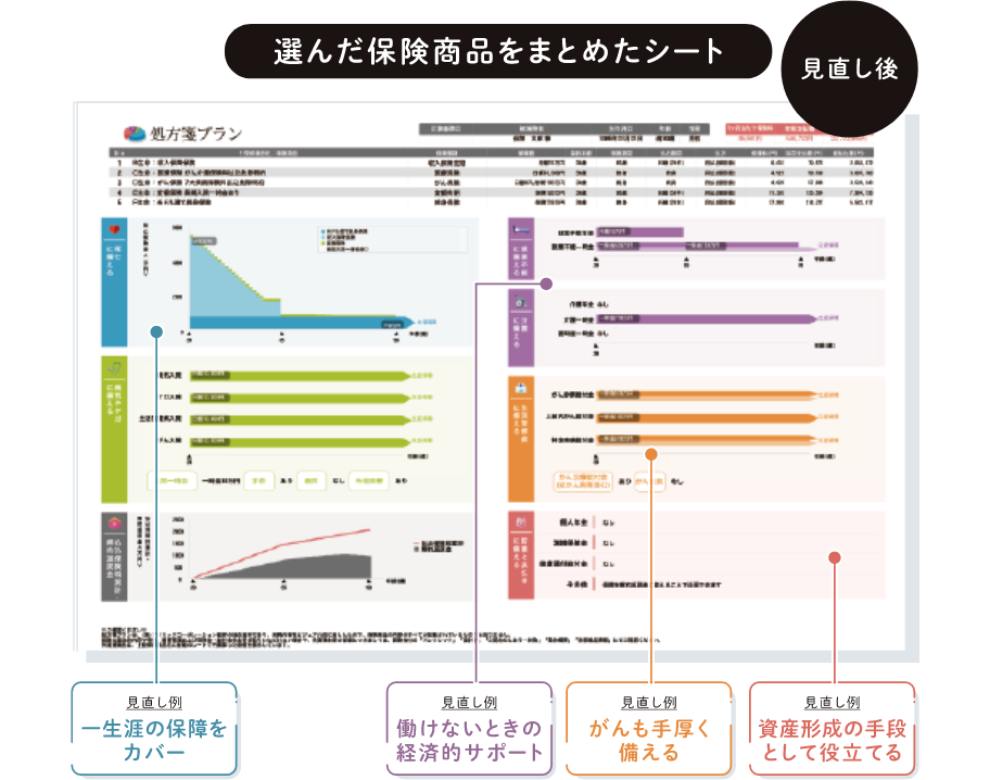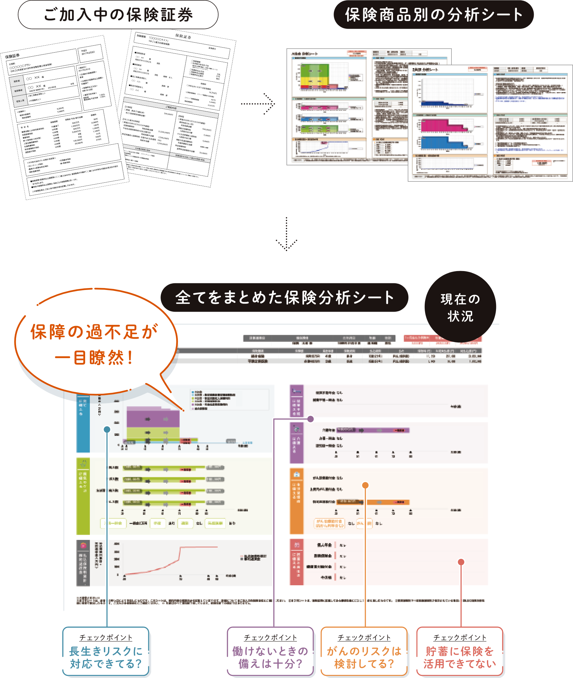 加入中の保険証券を1枚の「分析シート」にまとめます。今の保険がご希望に合っているか、保障の過不足が一目でわかります。