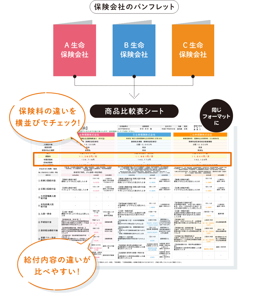 「比較表」で各社の商品を同一フォーマット化。保険料や保障内容の違いを横並びで確認でき、わかりにくかった各社の違いが一目でわかります。