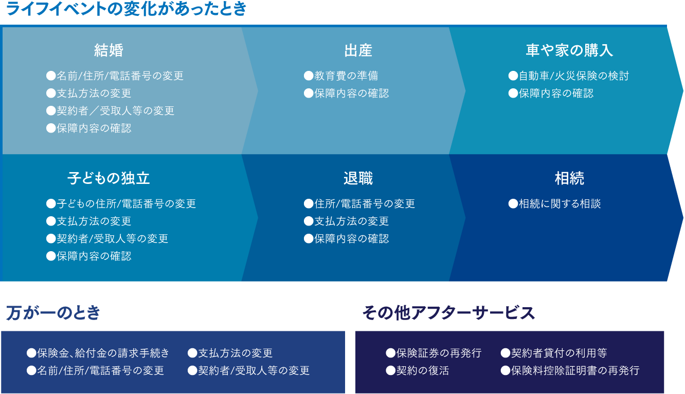 ご意向に沿った保険に加入することはもちろん大切ですが、いざ保険が必要になった時のフォローや、ライフイベントに応じた保険の見直しなど、長く安心して人生を歩んでいただくためのサポートに力をいれています。