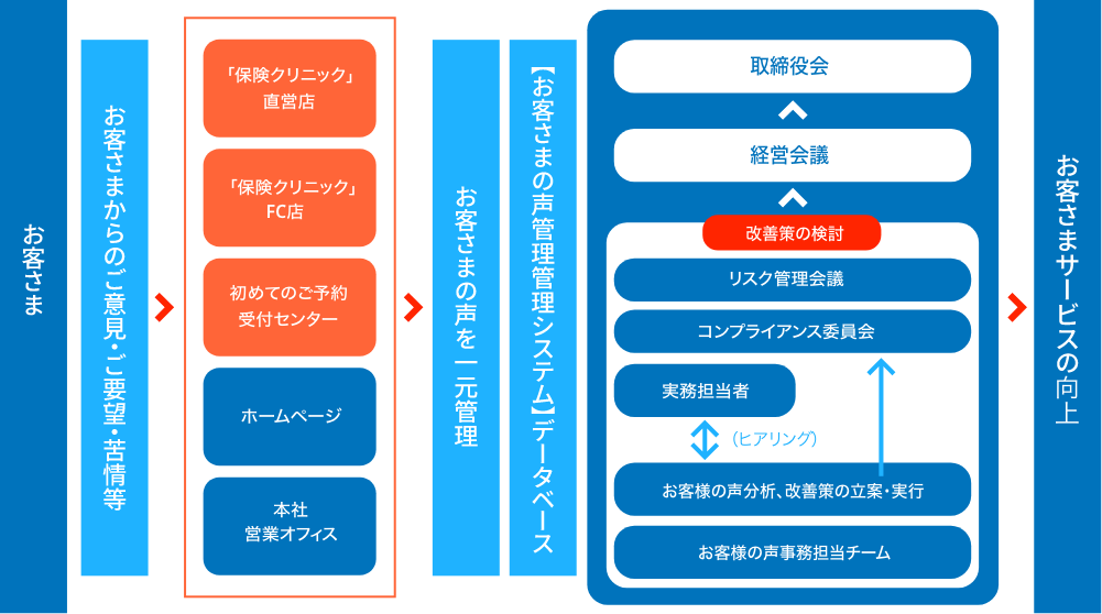 - 毎月、『保険クリニック』全店舗ならびに当社に寄せられたお客さまの声を分析し、経営改善に活かしています。