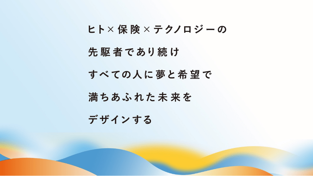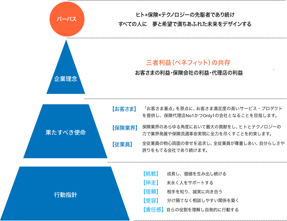 - 私たちは【三者利益の共存】を実現するために、ヒト×保険×テクノロジーの先駆者として誇りを持ち、行動指針(挑戦・伴走・信頼・受容・責任感)に則って、業務をやり遂げます。