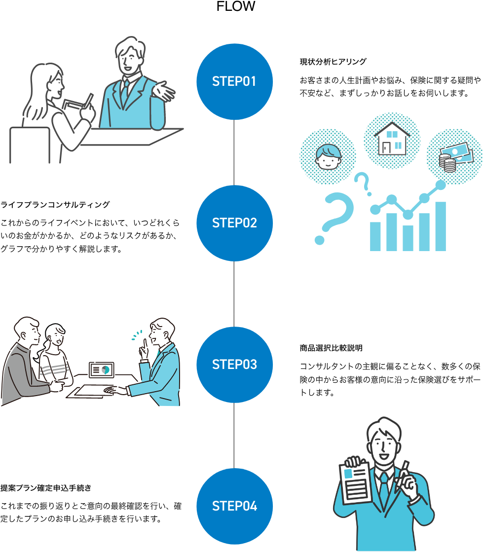 お客さま一人ひとりの生活設計(ライフプラン)をもとに専門のコンサルタントが、分かりづらいと言われている生命保険を、分かりやすく図示したシートにまとめて説明し、数多くの保険商品のなかから、お客さまのご意向に沿った保険選びをサポートします。